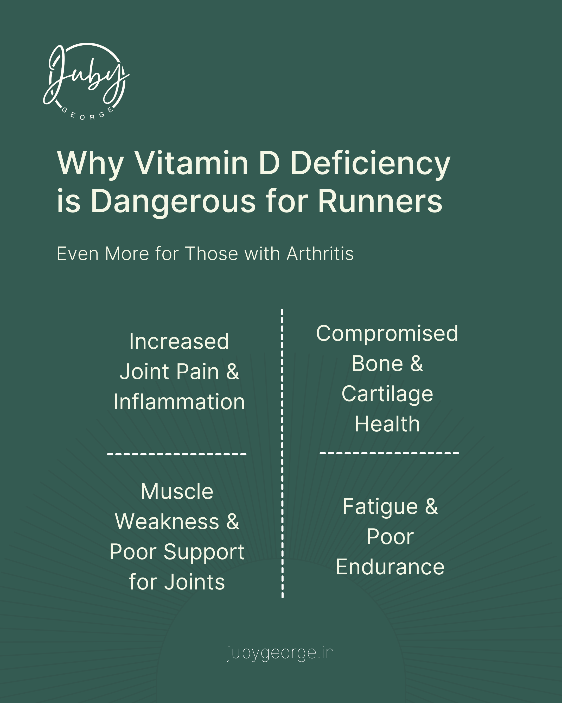 Vitamin D deficiency leads to muscle weakness. Weaker muscles make joints work harder, worsening arthritis symptoms during running.