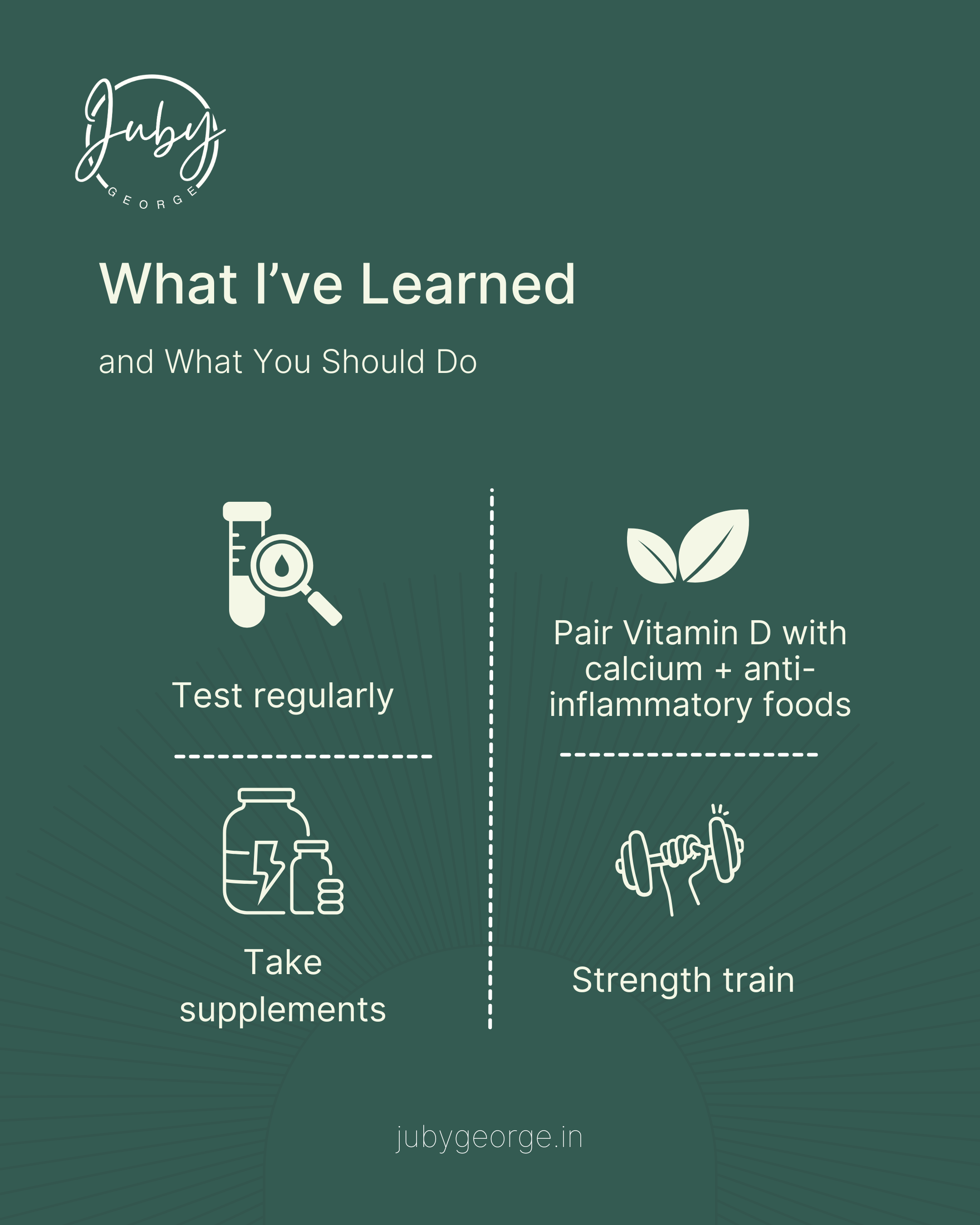 - Pair Vitamin D with calcium + anti-inflammatory foods.
