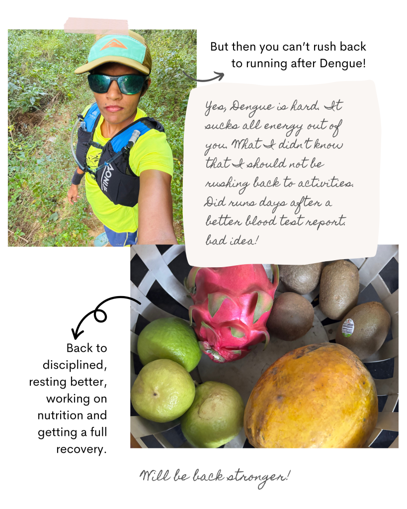 Recovery after Dengue isn’t quick. It drains every bit of energy. Decided to start running (slow and easy) after a ‘good’ blood test report when everything looked ‘improving’. But my doctor said a big NO… that was irresponsible of me not realising how bad it can rebound if body has not recovered properly. Some bonus miles today can wreak your whole season.